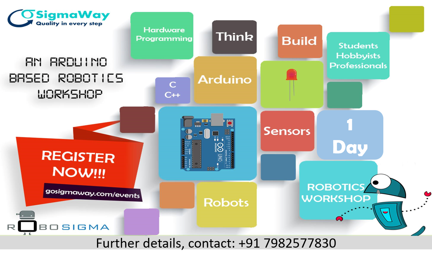 Sigmaway brings a 1-Day Arduino Beginner's Workshop. This workshop will be a real time project based one so if you have that quench of learning new and more about electronics and robotics and want to take first step, this is the opportunity for you!!!